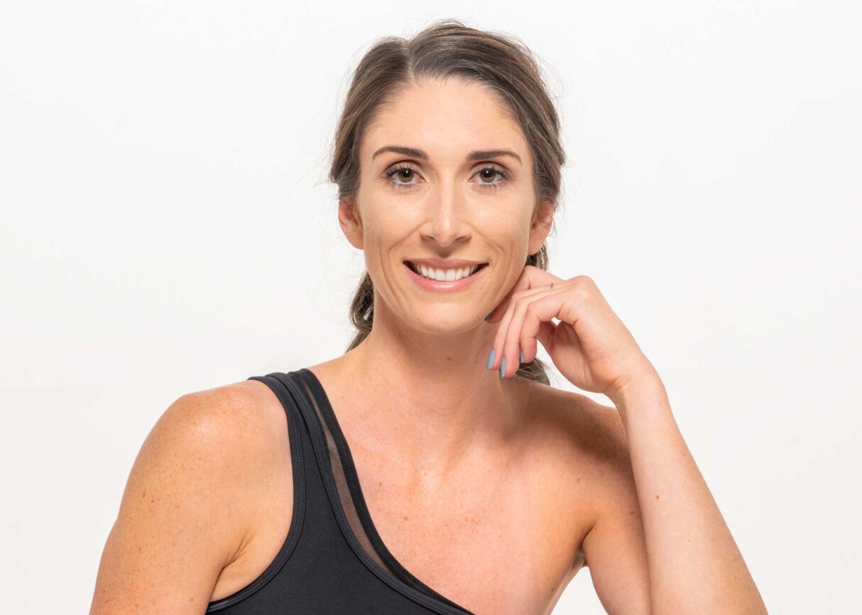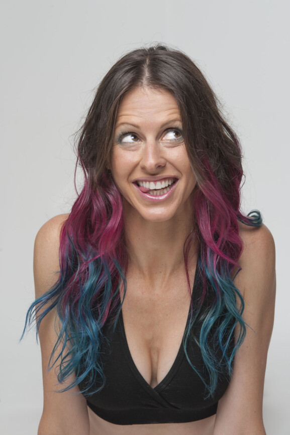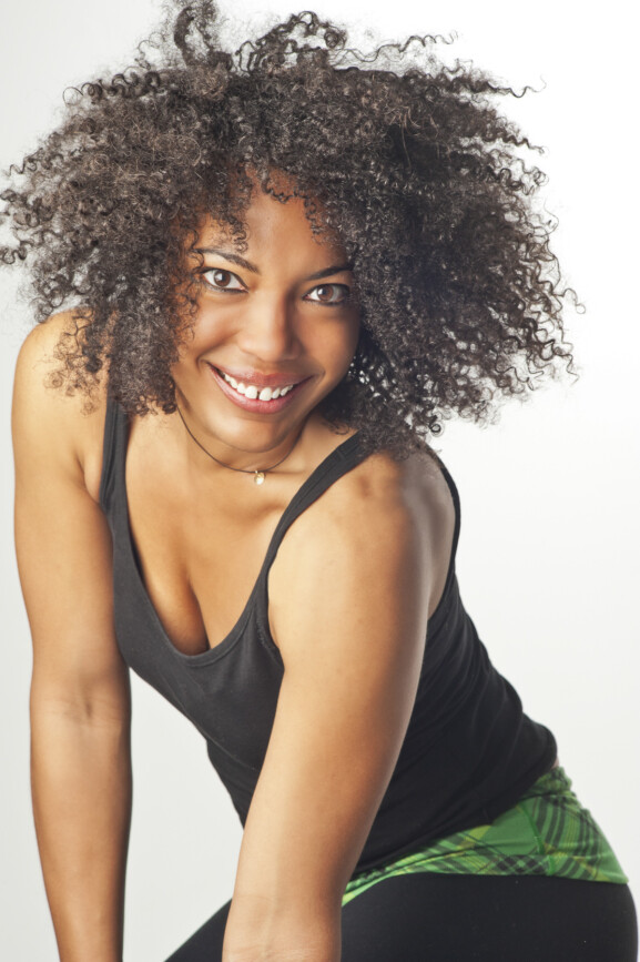 Smiling woman in yoga clothes and wild hair