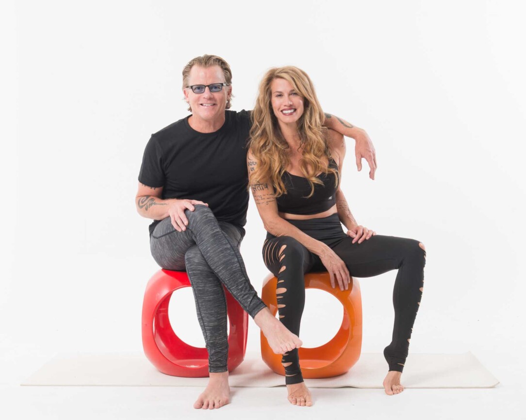 Couple seated on floor in yoga clothes
